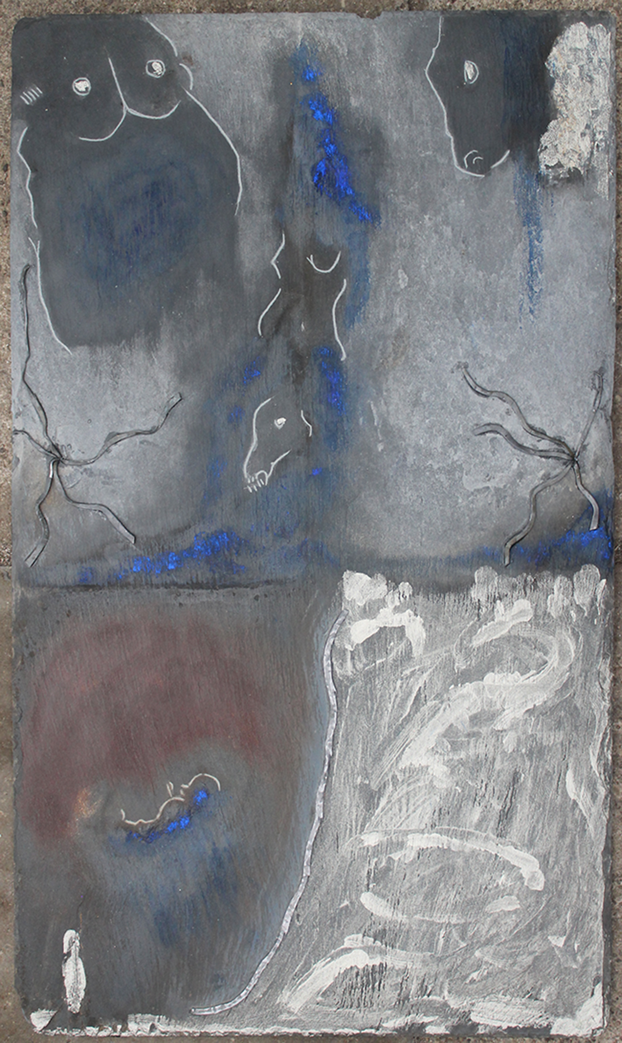 nogle skiferplader, og en dukke til senere brug. Disse materialer lå i lang tid, indtil jeg en dag for otte år siden begyndte at arbejde med dem, og finde ting, forme ting der kunne bruges til at fortælle en historie. – Sådan opstod mine vægskulpturer. Den måde at fortælle historier på fascinerer mig, røre ved myterne og fordybe mig på samme måde som når jeg står på en scene.